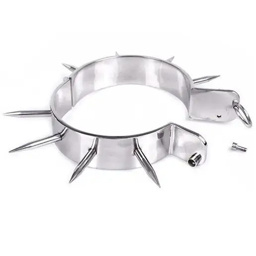 Este collar de metal cromado se cierra con una llave allen incluida. Tiene un acabado brillante con puntas punzantes. El collar tiene una anilla en O para enganchar una cadena con mosquetón, una cuerda o cualquier otro artículo de bondage.