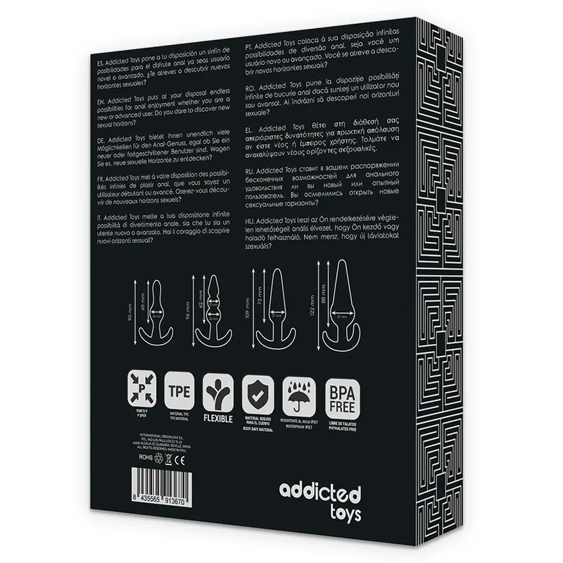El Set de 4 Plugs Anales de Addicted Toys es una colección diseñada para quienes buscan explorar nuevas dimensiones del placer. Cada plug presenta una forma y un tamaño únicos, permitiéndote elegir el que mejor se adapte a tus preferencias. Con un enfoque en la calidad y la seguridad, estos plugs están fabricados con material body-safe, libre de ftalatos, garantizando una experiencia placentera y libre de preocupaciones.
