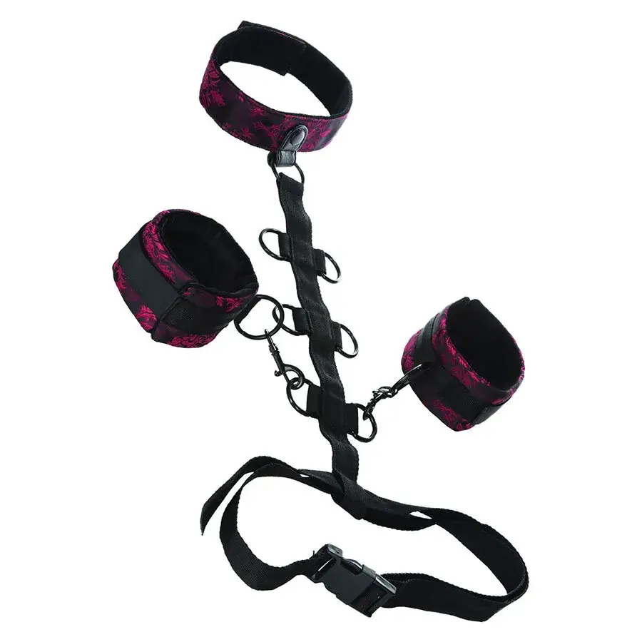 El Collar de Atadura Scandal de CalExotics es más que un simple accesorio; es una invitación a explorar la sensualidad del juego bondage. Diseñado con elegancia y atención al detalle, este collar cuenta con un lujoso brocado en rojo y negro, combinado con un suave forro interior que garantiza comodidad. Las esposas desmontables y las múltiples opciones de sujeción permiten que la experiencia sea totalmente personalizable, aumentando la emoción y la conexión con tu pareja.