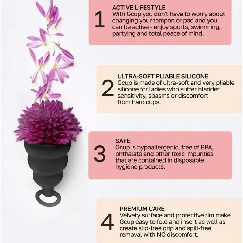 La **Gcup Copa Menstrual Negra** es una innovadora solución para la higiene menstrual, diseñada para adaptarse a tu estilo de vida activo. Con su forma de campana y una **válvula de retención interna**, esta copa menstrual se asegura de que no haya fugas, permitiéndote disfrutar de tus actividades diarias, deportes, e incluso nadar, sin preocupaciones. Fabricada en **silicona 100% segura**, la Gcup no solo es cómoda, sino también respetuosa con el medio ambiente, lo que la convierte en una opción ideal para las mujeres modernas.