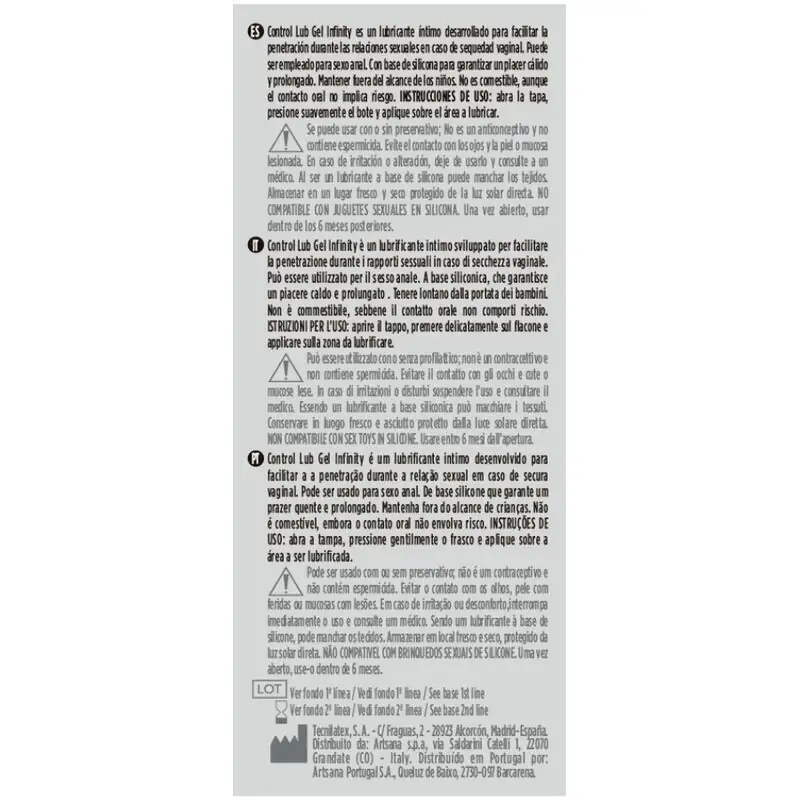 Descubre el Control Lub Gel Infinity, un lubricante íntimo de base silicona diseñado para mejorar tu experiencia sexual. Ideal para uso vaginal y anal, proporciona una lubricación duradera, perfecta para momentos de pasión. Su fórmula es compatible con preservativos, asegurando así un disfrute sin preocupaciones. ¡Está listo para llevar tu placer al siguiente nivel!