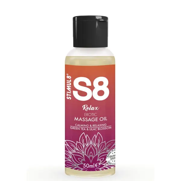 Descubre el placer de un masaje sensual con el aceite de masaje erótico S8 Relax. Esta mezcla única de aceites naturales, como el de jojoba y almendras, nutre y relaja tu piel, dejándola suave y sedosa. Con su aroma a té verde, transforma tus momentos íntimos en una experiencia inolvidable que despierta tus sentidos.
