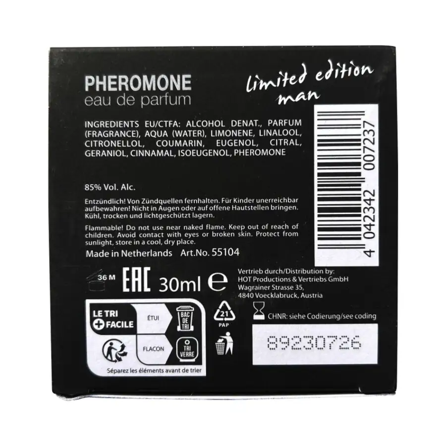 | Material: | Alcohol desnaturalizado, fragancia de alta calidad, feromonas |