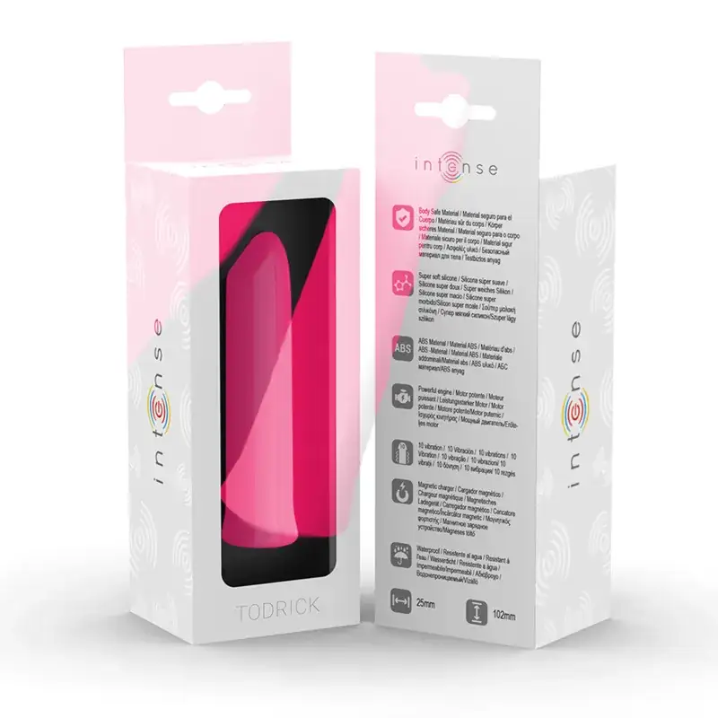 Descubre la bala vibradora TODRICK de INTENSE, un elegante dispositivo de estimulación en color rosa. Con 10 modos de vibración y fabricado en silicona suave de grado médico, es perfecto para experiencias personalizadas y discretas. Su diseño sumergible y cargador magnético aseguran que siempre esté listo para ofrecerte el placer que mereces.