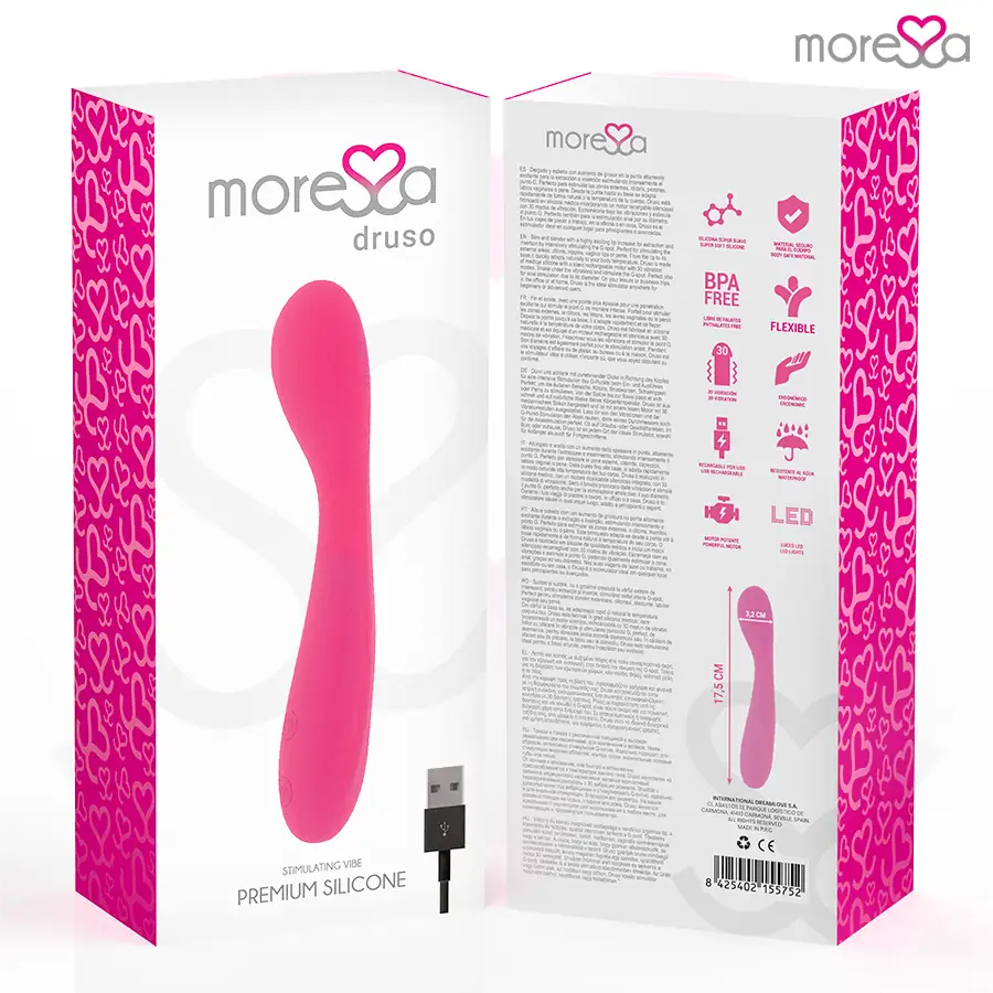 Descubre el poder del placer con el Druso Masajeador Duo de MORESSA. Diseñado para estimular intensamente el punto G y otras zonas erógenas, este masajeador de silicona médica cuenta con un motor recargable y 30 modos de vibración. Su diseño esbelto y ergonómico lo convierte en el compañero perfecto para disfrutar tanto en casa como en tus viajes. ¡Explora nuevas sensaciones y despierta tu placer!