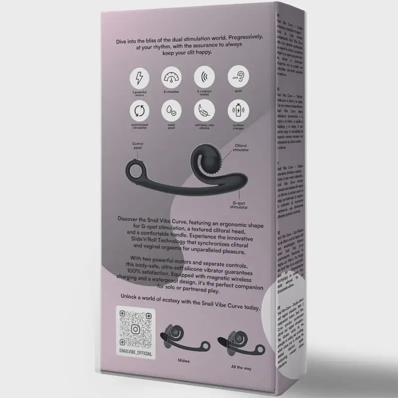 Descubre el SNAIL VIBE Curve, un vibrador diseñado específicamente para brindarte una experiencia única de placer. Con su forma ergonómica, este vibrador está destinado a estimular el punto G mientras su cabeza texturizada cuida de tu clítoris, garantizando un placer sin igual. Gracias a la innovadora tecnología Slide’n’Roll, podrás experimentar orgasmos vaginales y clitorianos sincronizados, elevando tu satisfacción a un nuevo nivel. Con más de 600 combinaciones de modos y velocidades, este vibrador se adapta a tus deseos más profundos.