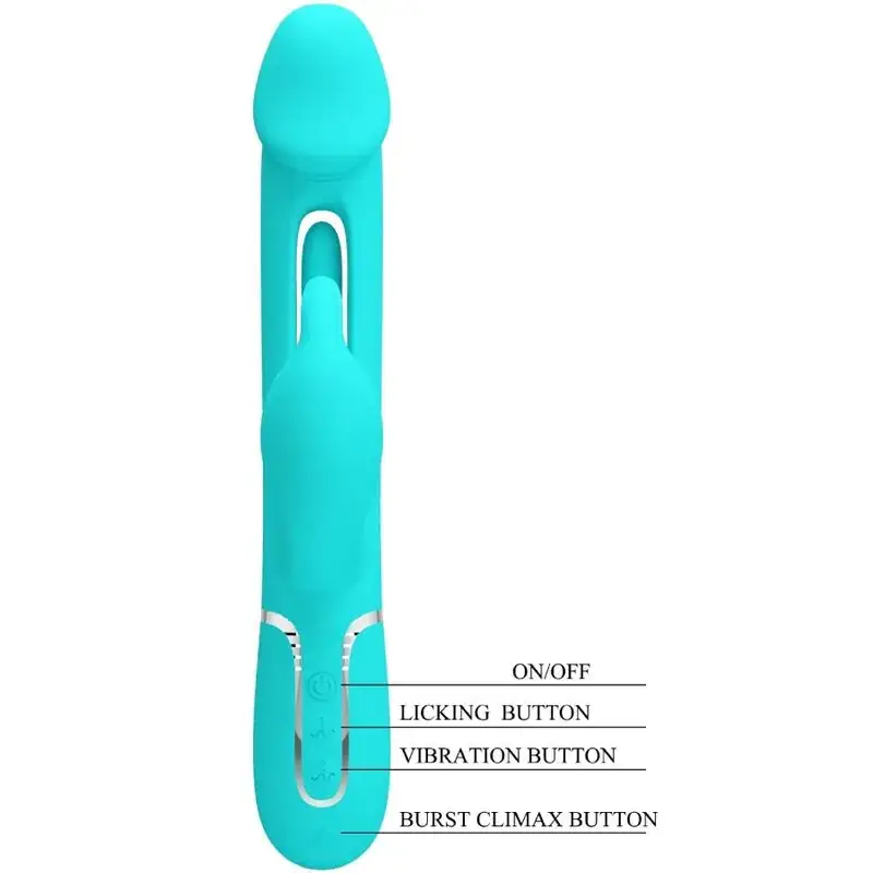El Pretty Love – Kampas Vibrador Rabbit 3 en 1 es un juguete erótico diseñado para ofrecerte una experiencia de placer inigualable. Con un diseño innovador, este vibrador combina la funcionalidad de un vibrador clásico con la excitación adicional de una lengua oscilante, todo en un solo dispositivo. Su elegante color verde agua lo convierte en un atractivo visual que complementará tus momentos de intimidad.
