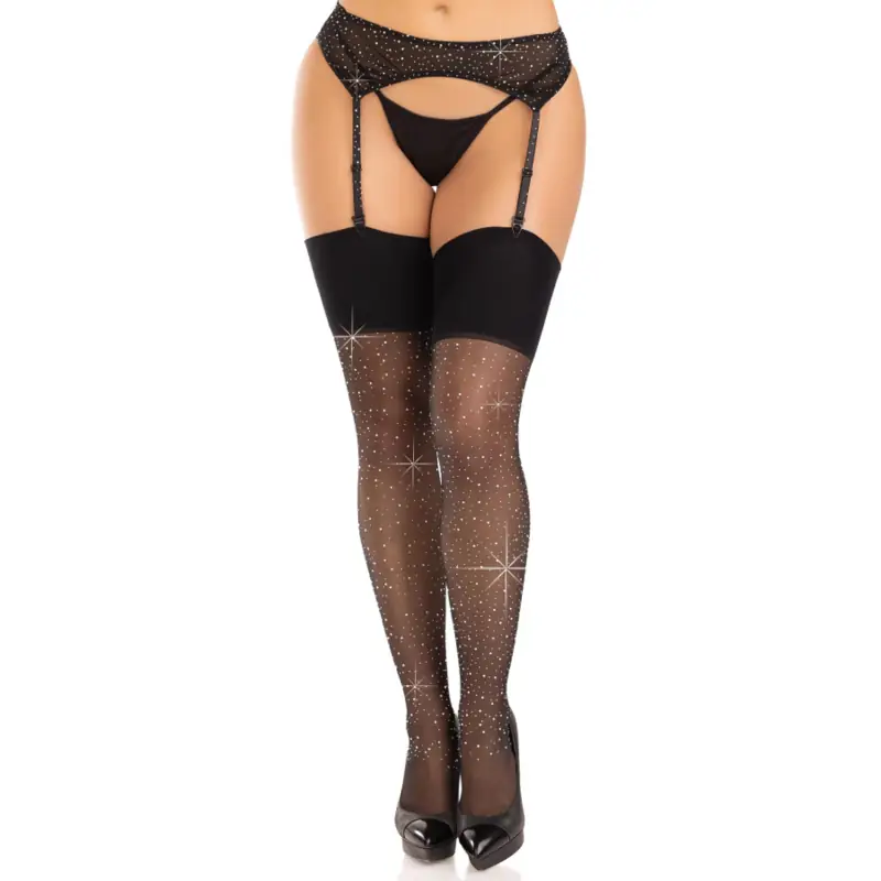 This type of stockings are perfect for special occasions, such as formal events, parties or intimate moments. The combination of transparency and the shine of rhinestones creates a sensual and sophisticated look that can enhance any lingerie set or wardrobe.