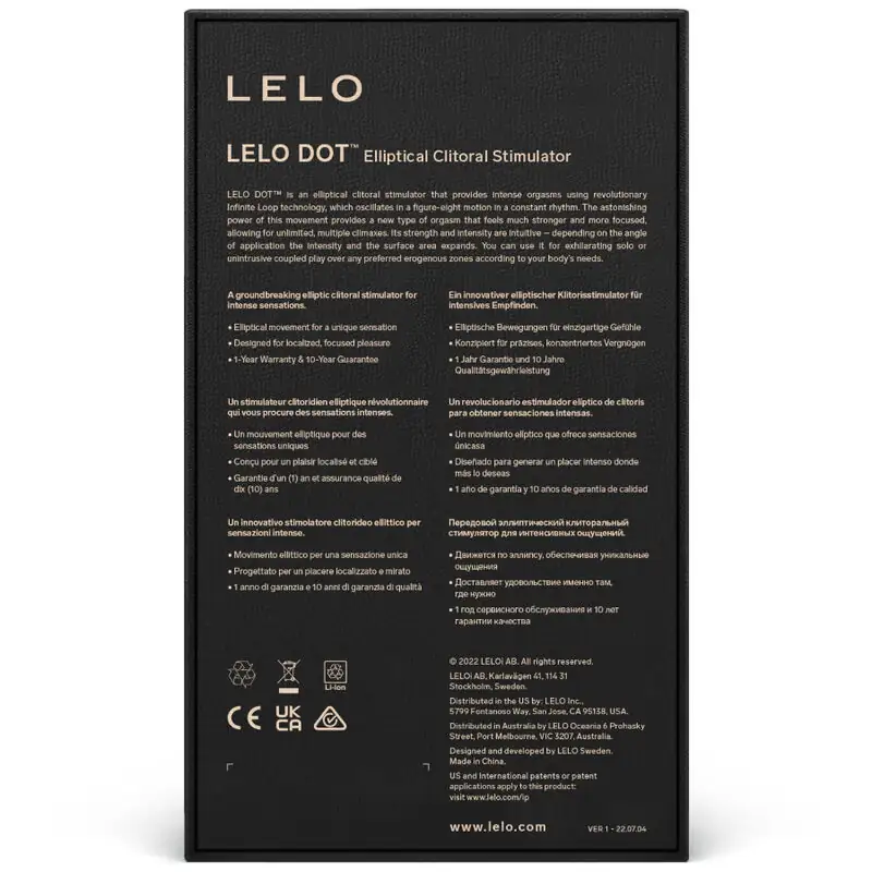 LELO DOT is an elliptical clitoral stimulator that uses Infinite Loop technology to introduce a revolutionary movement: figure-eight oscillation with a constant rhythm. It's ideal for those looking to try something new, eager to get busy exploring new orgasmic avenues. Different pleasure patterns with different intensities packed within its innovative shape make LELO DOT perfect for exciting solo or partner play without intrusions. It allows for a versatile approach to self-pleasure, allowing you to stimulate different erogenous zones with a single device.