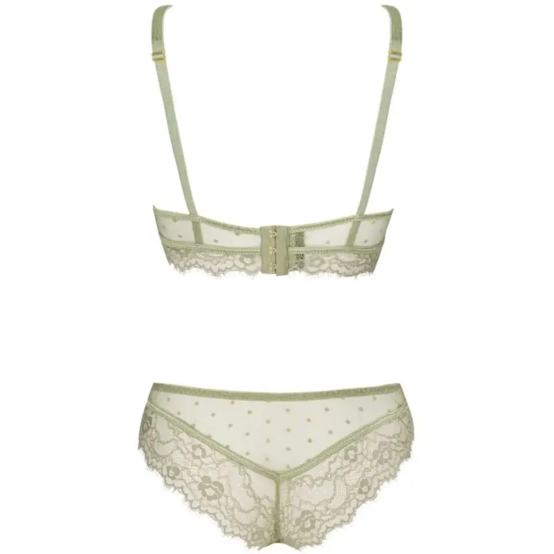 The lingerie set is a lace work of art. The bra is not stiffened and is additionally equipped with two straps on the neckline, so when peeking out from under a shirt or blouse, it will certainly attract great attention. The bra supports the bust well, which means that women with larger breasts will also be able to wear it. Tempting underwear in off-green color also includes comfortable and at the same time sensual lace panties, which, even though they are slightly more built, still create a sexy atmosphere. The design of the panties perfectly highlights women’s buttocks, making every woman feel special. The set is perfect for everyday wear as well as for slightly more special moments.