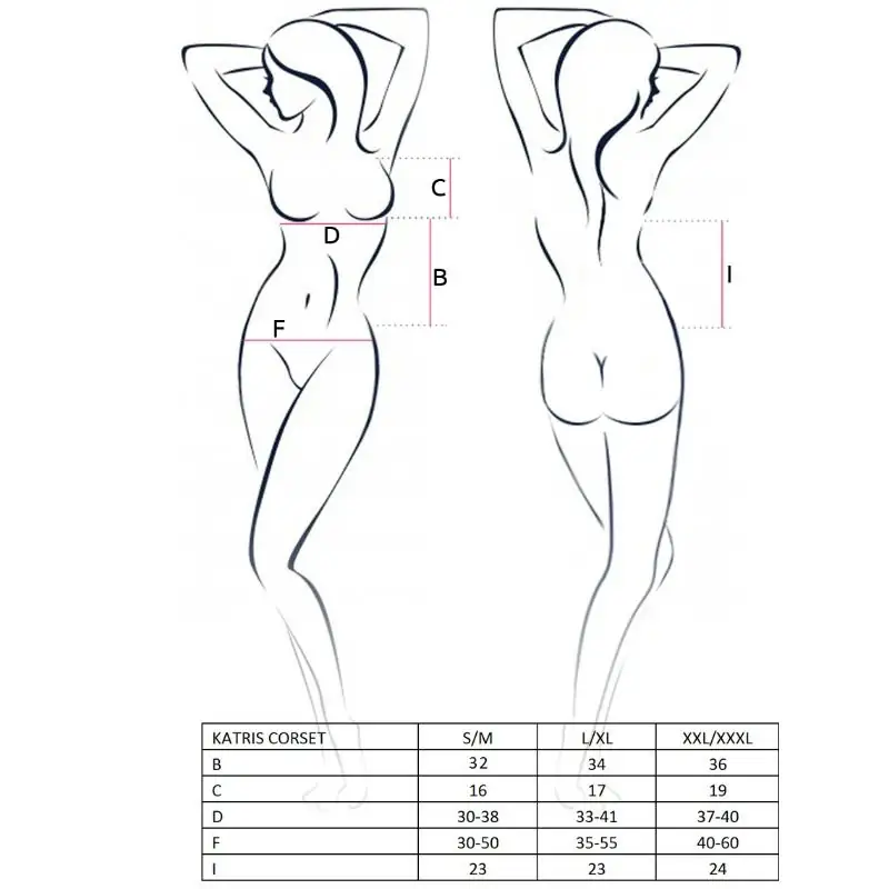 El Corset Katriss Black está disponible en tamaño S/M, diseñado para adaptarse a diversas figuras.