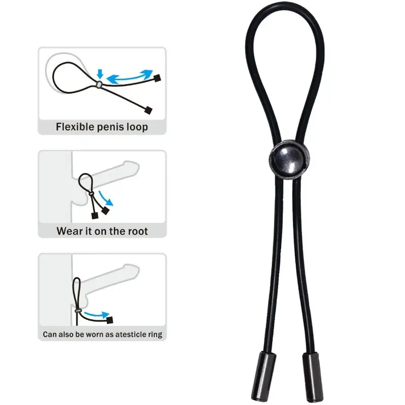 The penis loop is attached. It is controlled by a synthetic bead so that it can be placed over the penis and testicles. You can individually adjust the diameter to the size of the penis. In this way, the intensity of the blood flow restriction effect can be adjusted according to personal wishes.