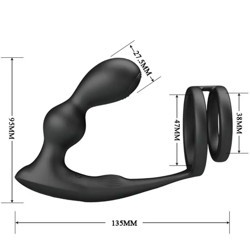 This remote controlled cock ring with anal plug is a combination cock ring and vibrating anal plug that is held securely in place.