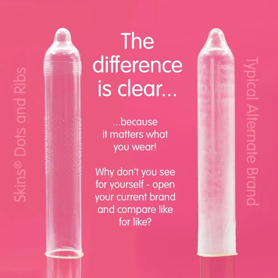 Enhance your condom offering with the new Skins Dots & Ribs 8-Pack, a ready-to-use product that delivers superior performance and greater value. With up to 33% more condoms per pack than the market leader, this product is perfect for retailers looking to increase customer satisfaction and purchase value. Designed for mutual pleasure, Skins Dots & Ribs condoms feature raised ridges and strategically placed textured dots. The ridges enhance stimulation for the wearer, while the dots are designed to intensify sensation for both partners, working together to increase pleasure for both. Made with premium natural latex and ultra-thin for a second-skin feel, these condoms offer exceptional strength, clarity, and comfort.
