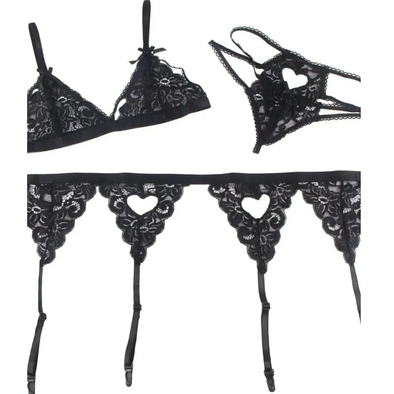 • Set de tres piezas que incluye: sujetador, liguero y tanga.