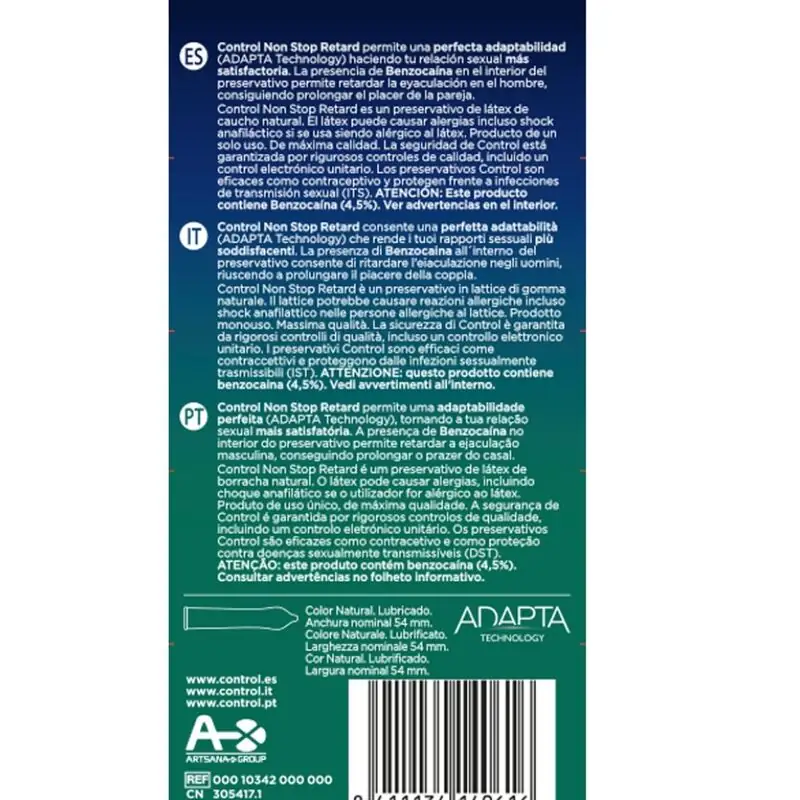 Los preservativos CONTROL Non Stop Retard son ideales para prolongar y retardar la relación sexual, aumentando el placer de ambos. Fabricados en látex natural y lubricados con Benzocaína, estos preservativos ofrecen un ajuste anatómico perfecto. ¡Descubre el placer sin límites con 12 unidades de protección y confort!