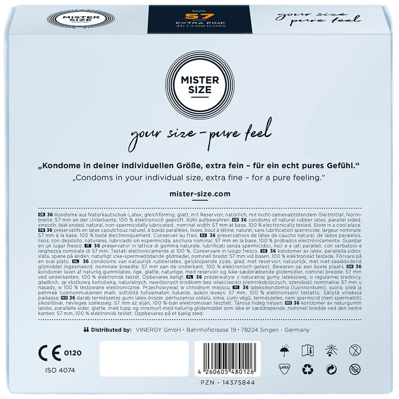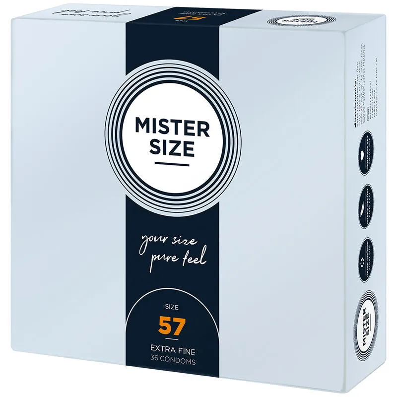 MISTER SIZE es una línea de preservativos de alta calidad, específicamente diseñados para ofrecer un ajuste perfecto y una experiencia sexual incomparable. Con un ancho nominal de 57 mm, están fabricados en látex de caucho natural, lo que garantiza una sensación natural al usarlos, permitiéndote disfrutar de cada momento sin distracciones.