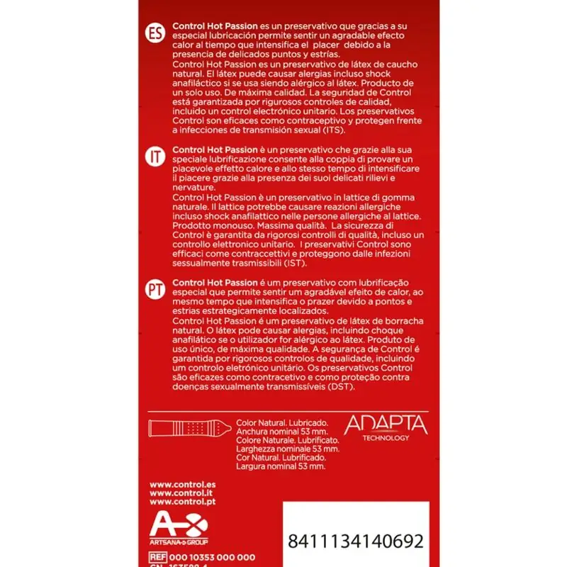 Los preservativos Control Hot Passion están diseñados para llevar tu experiencia íntima a un nuevo nivel. Con su efecto calor, sentirás una conexión más intensa y placentera. Perfectos para parejas que buscan explorar nuevas sensaciones, estos preservativos están elaborados con una lubricación especial que te hará vibrar de placer. Con una anchura nominal de 53 mm y su textura con puntos y estrías, cada momento será inolvidable.
