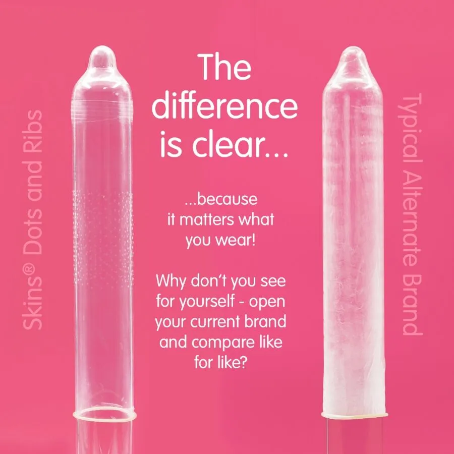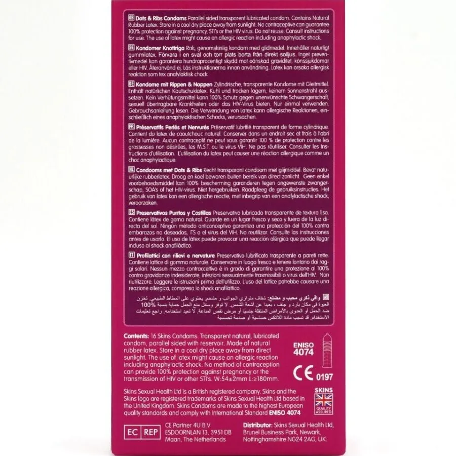 Descubre el placer elevado con los preservativos SKINS Dots & Ribs. Con nervaduras y puntos delicados, ofrecen una experiencia íntima única. Fabricados con látex natural, son tan finos que te sentirás como si no llevaras nada. ¡No comprometas tu seguridad y bienestar sexual! Perfectos para disfrutar de momentos inolvidables.